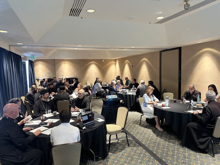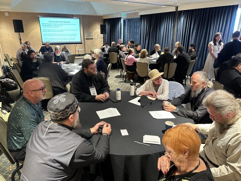 Close to 50 people gathered in Phoenix in advance of the All-American Council to participate in the Diocese’s Thriving Parishes Project retreat. Rectors and lay leaders from the initiative’s 20 participating parishes were joined by guests and observers, including a few from outside the Diocese and even outside the Orthodox Church in America who were intrigued by recent diocesan efforts to actively support church health. Also present were His Eminence, Archbishop Benjamin, His Grace Bishop Gerasim of Fort Worth, and Archimandrite Vasily (Permiakov), who stayed to participate in the break-out discussion groups.