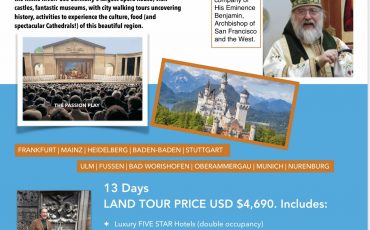 In the company of His Eminence Benjamin, Archbishop of San Francisco and the West, this is an absolute trip of a lifetime - First Class all the way! Tour highlights that include; The Oberammergau Passion Play performed only every ten years, truly a world-class spiritual experience., day long cruise through the most scenic area of the Rhine River. See Germany's largest opera house, visit castles, fantastic museums, with city walking tours uncovering history, activities to experience the culture, food (and spectacular Cathedrals!) of this beautiful region. Download the flyer here.