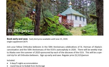 Join your fellow Orthodox believers in the 50th Anniversary celebrations of St. Herman of Alaska’s glorification and the 50th Anniversary of the OCA’s autocephaly in 2020. There will be weekly trips to Alaska over the summer of 2020 sponsored by each of the dioceses of the OCA. The Diocese of the West will sponsor their trip July 8-14, 2020. This will be a special trip for all Orthodox believers. Sign up early and reserve your space. Final cost to be determined.