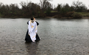 On Sunday, January 6th, the Theopany of Our Lord, God, and Savior Jesus Christ, as well as His baptism in the River Jordan by John the Forerunner, the Reverend Timothy Winegar and faithful of Elevation of the Holy Cross Parish in Sacramento gathered at the banks of the American River for the Great Blessing of Water. The American River is a 120 mile waterway that originates in the Sierra Nevada mountain range, and is known as the site where gold was discovered in 1848 that started the California Gold Rush. It flows into Folsom Lake just outside of Sacramento, and eventually confluences with the Sacramento River. By this confluence, the waters of the American flow into the San Francisco Bay Watershed. By flowing into the Bay, these waters then eventually join the Pacific Ocean and through the Pacific, reach the rest of the world. Thus, by blessing the river off of this rainy, rocky bank, the Orthodox faithful seen in these pictures invoke God's blessing on the living waters on the whole of His creation! "Great art Thou O Lord, and marvelous are Thy works, and there is no word sufficient to hymn Thy wonders!"